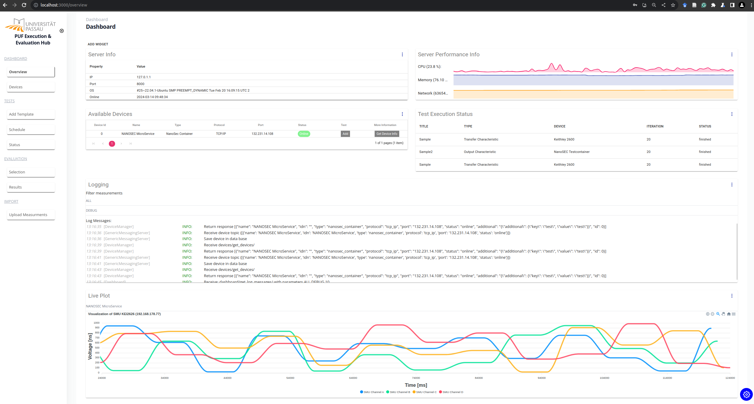 After the logging the dashboard is visualized showing general information, like the connected devices. the currently scheduled tests, logging messages and performance information to monitor the backend or the visualization of live data, e.g. when measurement devices like SMUs or oscilloscopes are connected. The dashboard is organized as grid with three rows, and can be customized by adding or deleting certain widgets.