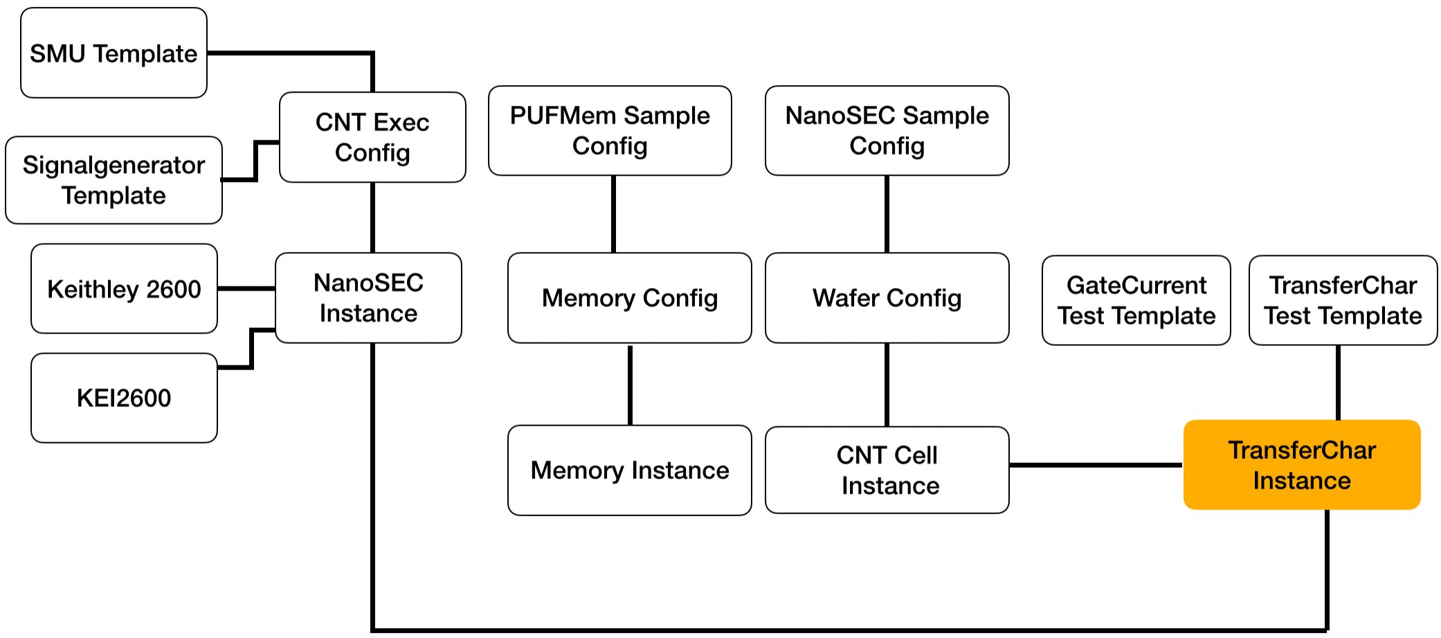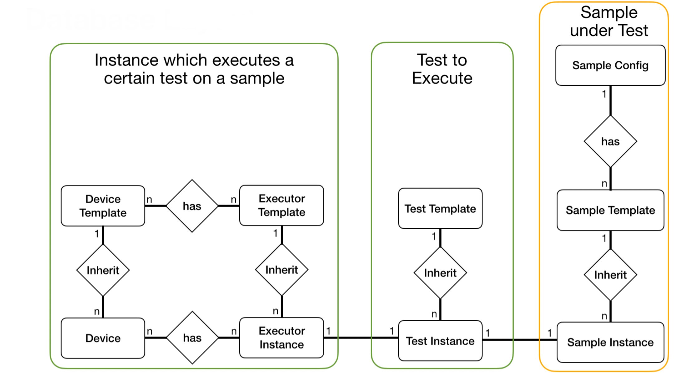 The definition of devices is slightly more complicated, as multiple devices may be necessary to execute a single test. For instance, conducting measurements, may require a micro-controller, a function generatorand an oscilloscope. These devices are defined as devices, based on a device template. All these devices are connected by a executer instance responsible, for the execution of a test instance.