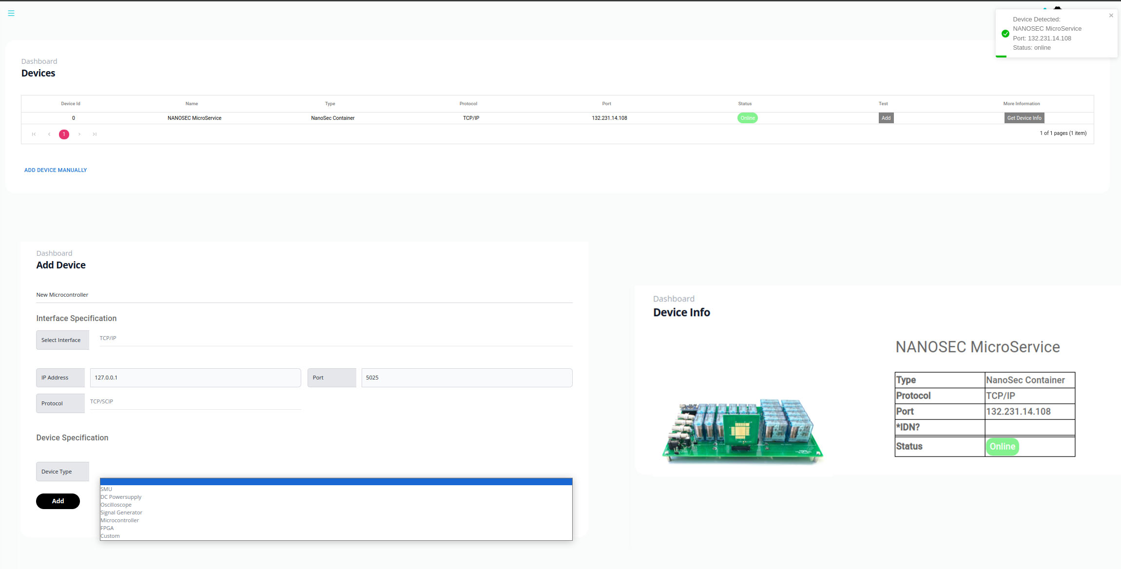 Additionally, users have the option to manually add devices through the designated “Add Device Manually” button. After the device was added, a heartbeat signal is initiated over the specified interface, providing information about the current state of the device. Furthermore, device specific information is shown on the device info page.