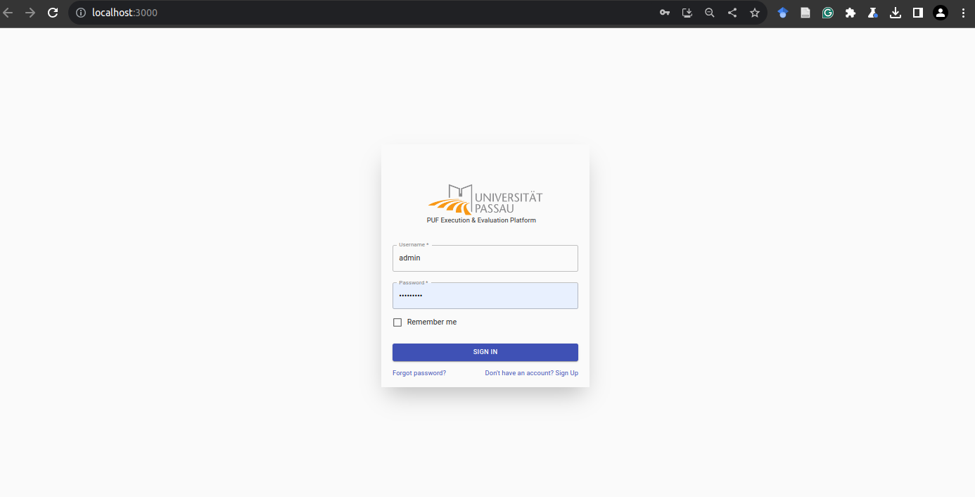 After compiling the web application, the graphical user interface is accessable by localhost:3000. If no current user session is running, the logging page is shown.