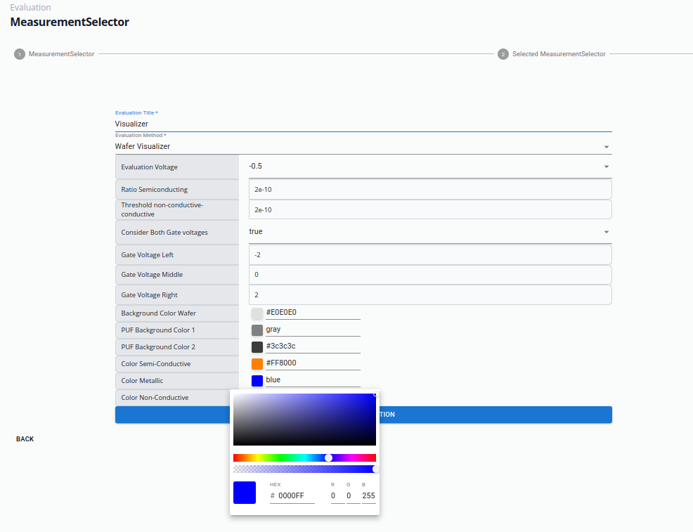 Based on the selected measurements, differnet post-processing and visualization algorithms are suggested, which can be customized. The visualization is executed by dedicated evaluation runner in the backend.