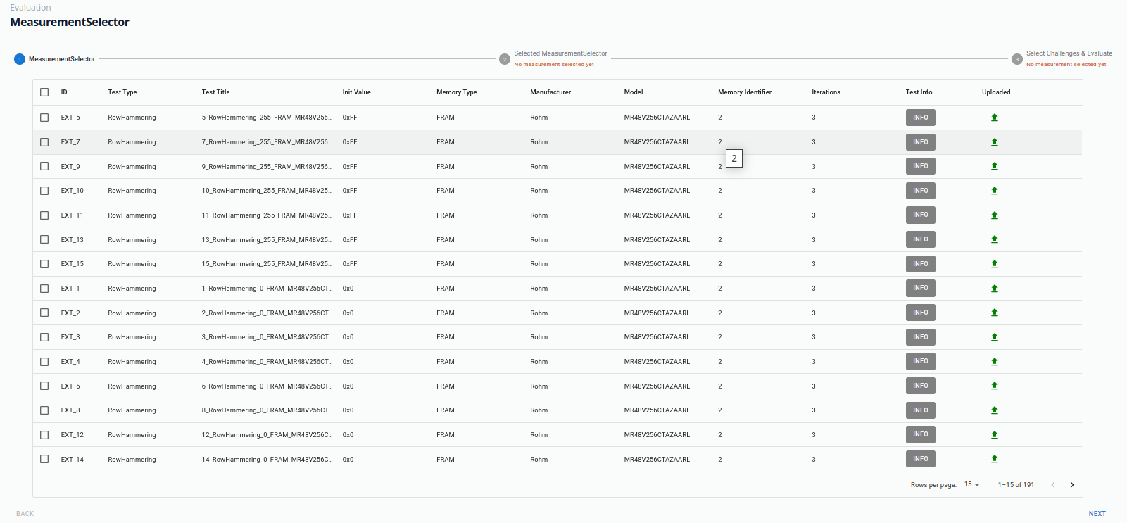 Mesurement results are stored in a seperated Postgres database, which supports a seperation between the measurement data and the states and config of the GUI and backend. This mechanism is explained in the backend chapter. On the Evaluation Selection Page, multiple measurements can be selected for further analysis and visualization.